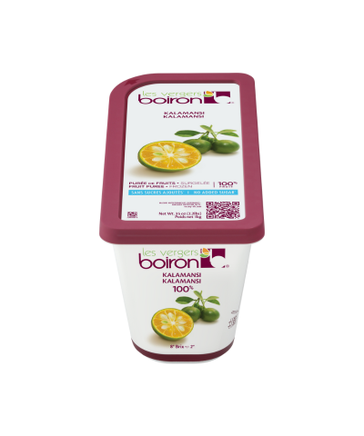 Les Vergers Boiron kalamansi 100% fruit puree creates gastronomic masterpieces. Made only with 100% real Filipino kalamansi fruit, this puree has a low sweetness, bitterness, and viscosity, and is high in aromatic fragrance, acidity, with an all-around full-bodied taste. It features an intensely tart flavor with a pleasant floral finish. This puree is made without preservatives and does not contain added sugars or artificial colors and flavors. In fact, this puree was created to maintain its original characteristics to let its most natural taste, color, and texture shine in your menu items, any time of the year.