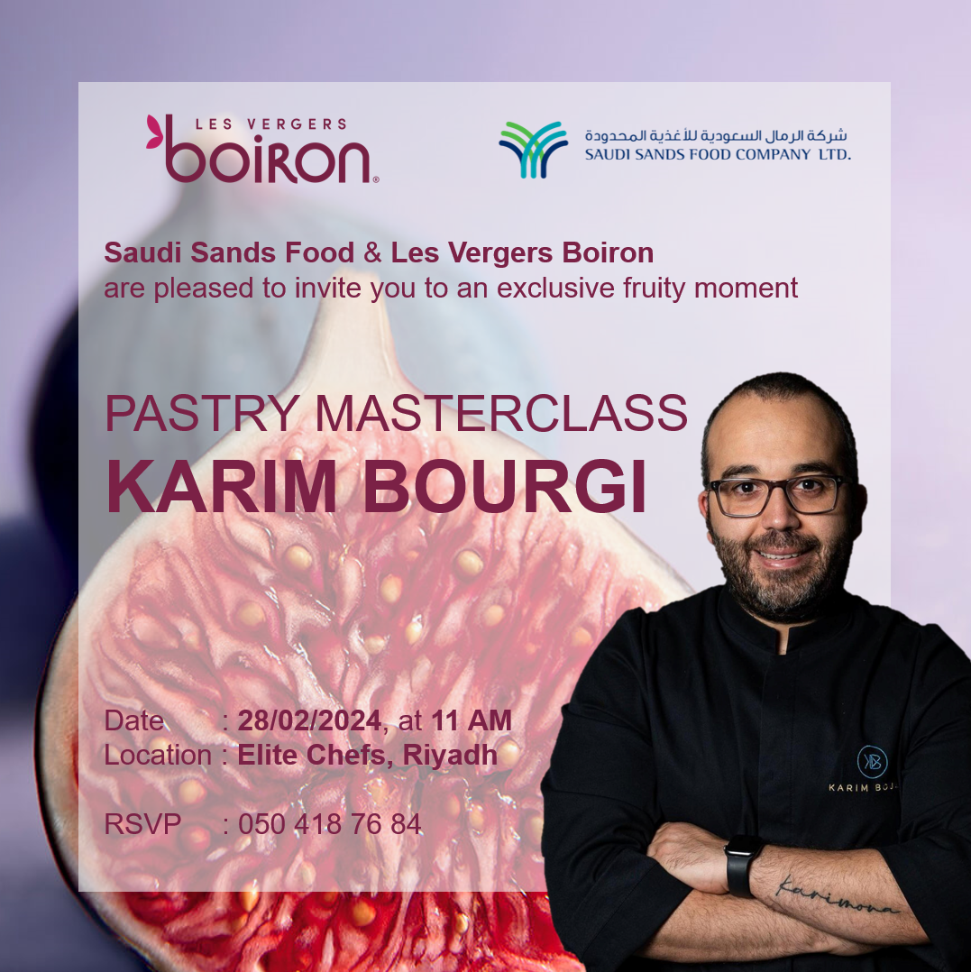 Saudi Sands Food, in collaboration with Les Vergers Boiron, is thrilled to announce an exclusive pastry masterclass led by the esteemed Chef Karim Bourgi. Set to take place on February 28th, 2024, in Riyadh, this event promises to be a delectable journey into the world of pastry making, highlighting the exquisite flavors of Les Vergers Boiron fruit purees.