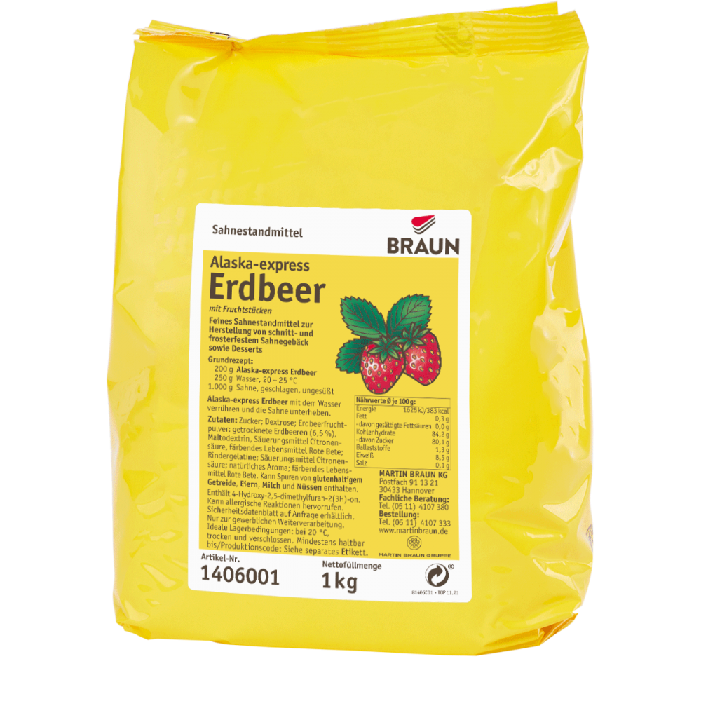 Introducing Alaska Express Strawberry: a powdered fresh cream stabilizer infused with real freeze-dried strawberry fruit pieces. Elevate your culinary creations with the delightful essence of strawberries, perfect for crafting cream tortes, slices, desserts, Swiss rolls, omelettes, and more. Indulge in the luscious flavor and vibrant color of fresh strawberries with every delicious bite.
