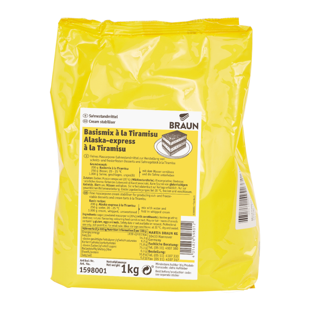Alaska-Express Tiramisu is a powdered fresh cream stabilizer with freeze-dried marscarpone powder. This product has a mascarpone flavor. It is freeze stable, cut stable, and safe and efficient to use. Alaska-Express Tiramisu is used in the production of various baking applications, including tortes, slices, desserts, Swiss rolls, and omelets.
