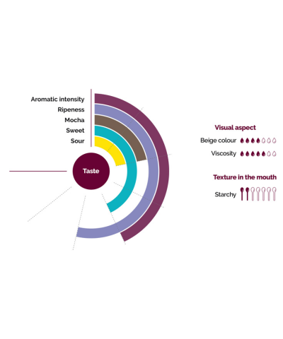 The perfect maturity of the selected fruit gives the puree a naturally sweet taste and aromatic notes of mocha coffee. Due to the presence of starch, the texture of this puree may seem sticky and floury.