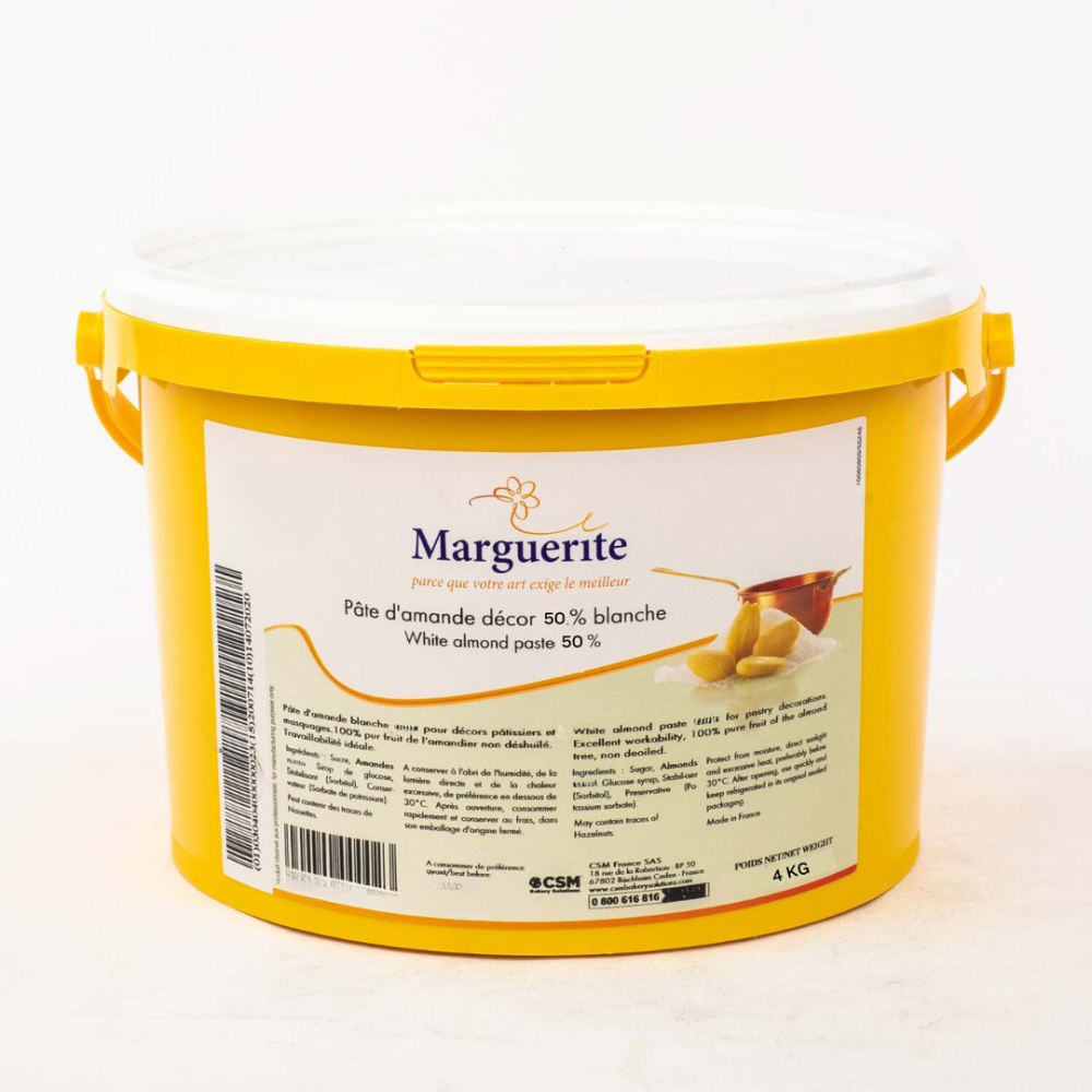 Marguerite Extra White Almond Paste 50% is a premium almond paste used in baking and confectionery. It's known for its high almond content and smooth texture, making it ideal for various pastry applications. This almond paste contains 50% almonds, giving it a rich almond flavor that enhances the taste of desserts like marzipan, almond croissants, cookies, and cakes.
